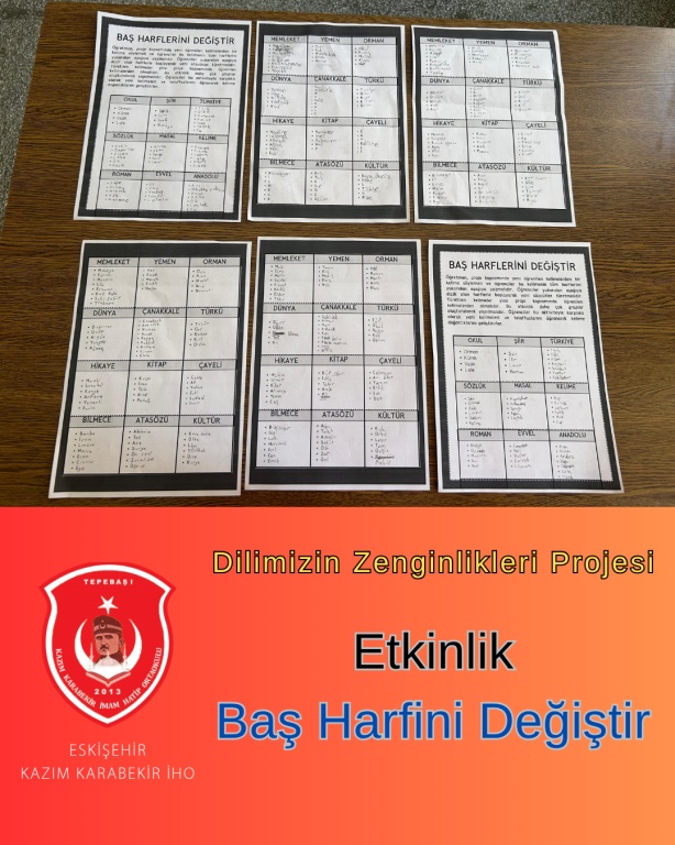 Dilimizin Zenginlikleri Projesi kapsamında düzenlenen mayıs ayı etkinliğinde, öğrencilerle birlikte eğlenceli ve öğretici bir dil etkinliği olan “Baş Harfini Değiştir” oyunu gerçekleştirildi. Etkinlikte öğrenciler kelimelerin baş harflerini değiştirerek yeni kelimeler buldu.